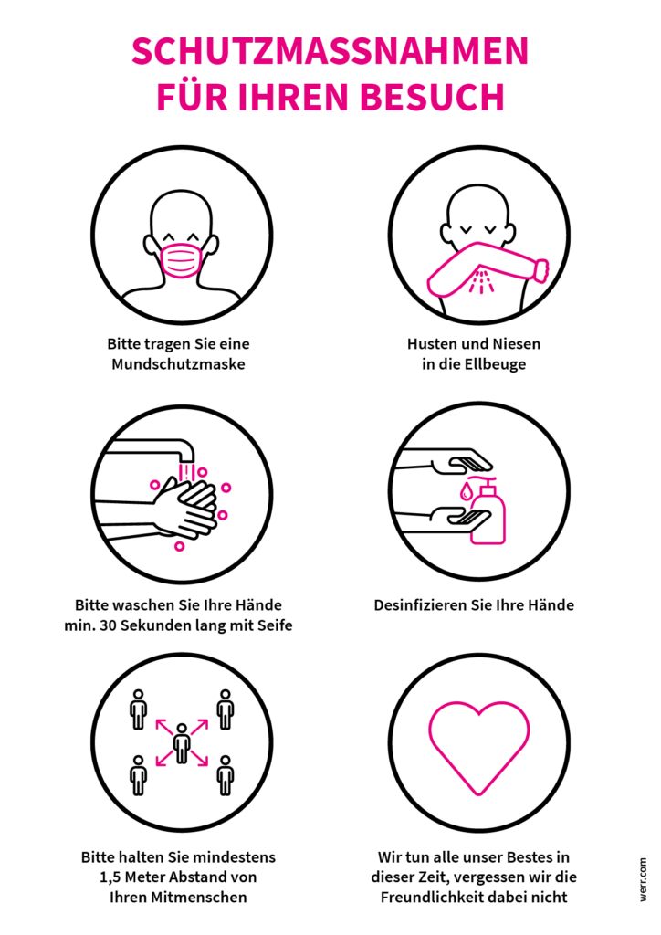So langsam werden die Ausgangsbeschränkungen gelockert, es gelten dennoch Schutzmaßnahmen. Hier können Sie für Ihre Praxis oder Ihr Ladengeschäft kostenlos ein Plakat mit den Schutzmaßnahmen herunterladen oder eine gebrandete Version mit Ihrem eigenen Logo kostenlos bestellen.