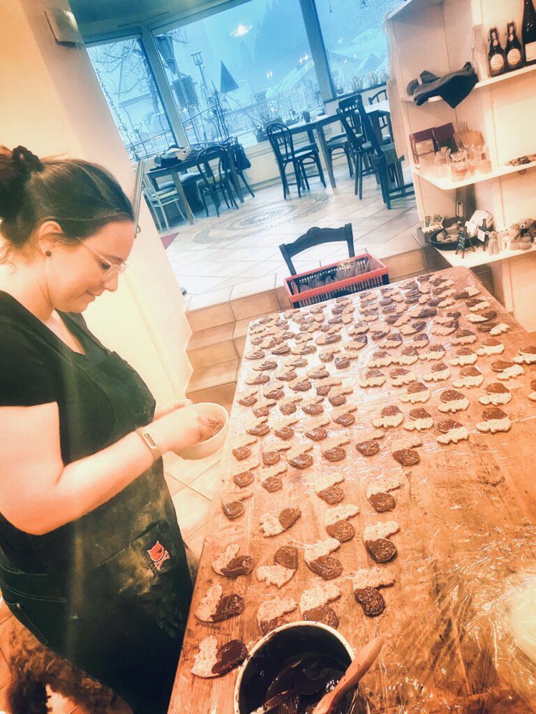 Den Teig etwa 3 mm dick ausrollen und mit beliebigen Ausstechern ausstechen. Bei 180° C Umluft für 7-10 Minuten auf einem Backbleck mit Backpapier backen. Währenddessen die restliche Schokolade über dem Wasserbad schmelzen und auf den noch warmen Keksen verteilen.